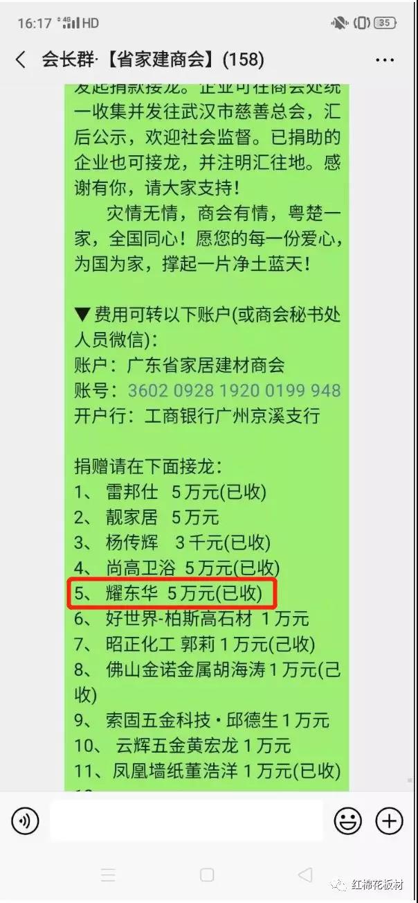 没有微弱星光,哪有浩瀚星河?点滴的善举汇成大爱。 疫情防控的严峻形势让我们感到十分焦心,从除夕夜开始,广东省家居建材商会的企业家们就纷纷伸出援手,用各种方式支援这场抗灾战役,作为商会会长单位,耀东华公司也积极捐款,以己之力,通过商会,汇集成更大的力量,共同支援武汉这场抗灾战役。