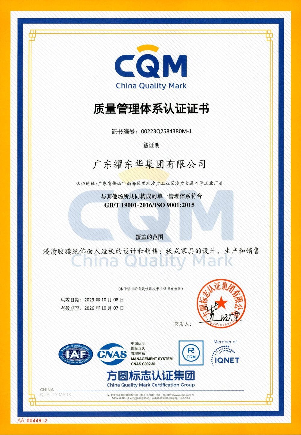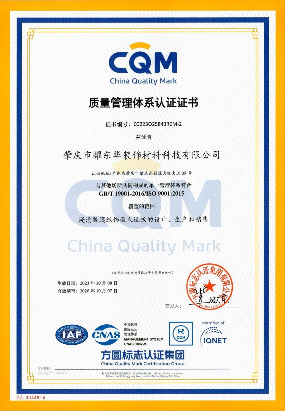 肇庆耀东华 ISO9001证书
