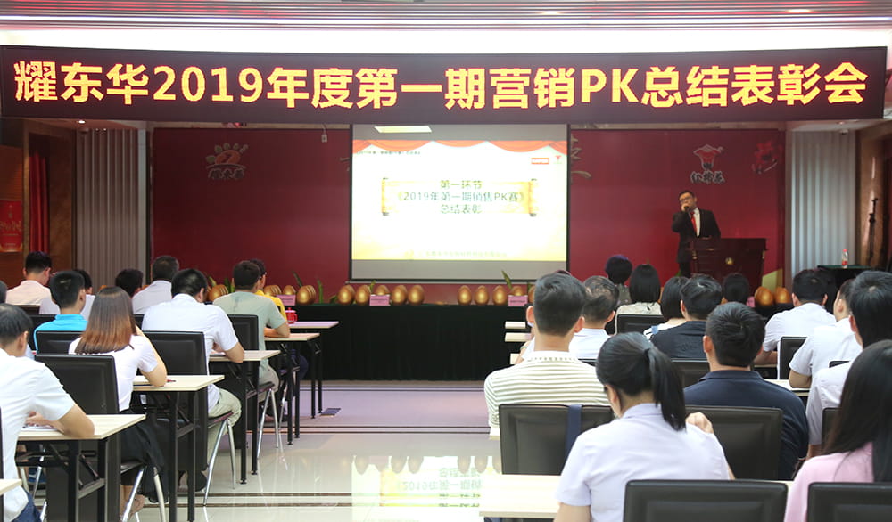 2019年7月26日,耀东华公司在佛山总部隆重召开了2019年第一期营销PK总结表彰会,公司副董事长吴惠仪、总经理罗山鹰、副总经理兼营销总监郭占河参加总结会,对2019年上半年业务突出的营销精英进行表彰,并颁发了证书和奖金。