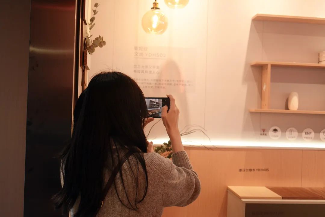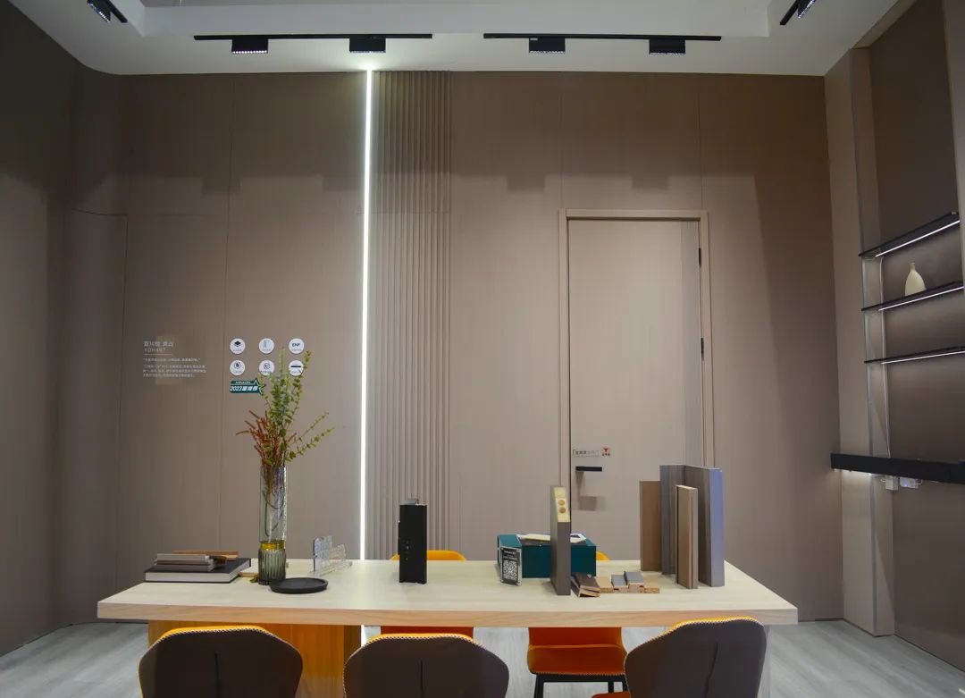 本次展会上的重点产品之一——银晶板,开发灵感来源于天然金丝楠木皮的水波纹,选用进口的汽车金属粉,通过数码涂装加上3D金属工艺开发而成,该工艺既保留了原来的底纹花色,又将表面效果提升质感及层次感,呈现高贵内涵的层次质感。